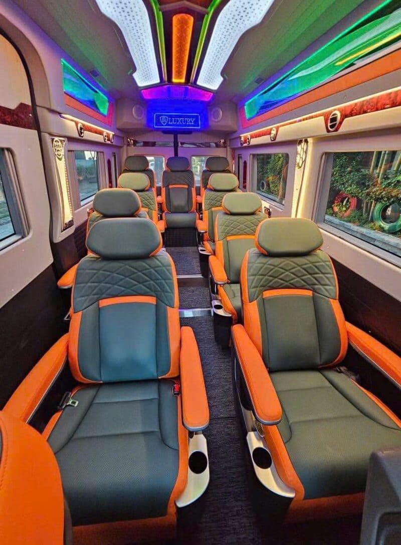 Hệ thống xe limousine từ 9 đến 15 chỗ được đầu tư đồng bộ, ghế ngồi rộng, có massage nhẹ, cổng sạc điện thoại và điều hòa hoạt động ổn định. Khoang hành lý được sắp xếp gọn gàng, đáp ứng tốt nhu cầu mang theo đồ cá nhân hoặc hành lý du lịch.
