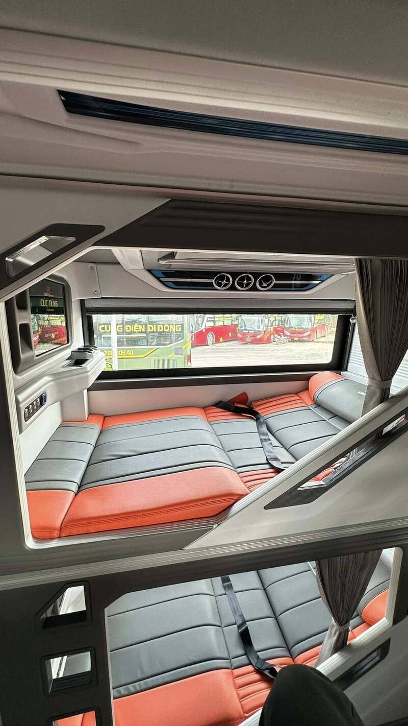 Mỗi giường nằm được bố trí chăn, gối sạch sẽ, ổ cắm sạc tiện lợi, phù hợp cho hành trình dài ngày. Cách sắp xếp hai tầng giường giúp khoang xe thông thoáng, hạn chế cảm giác bí bách khi xe di chuyển liên tục nhiều giờ.
