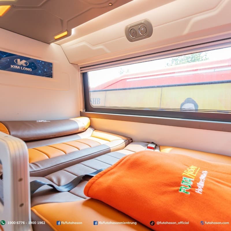 Trong khoang xe, giường nằm được bố trí vừa vặn, thoải mái cho hành trình dài. Tài xế am hiểu cung đường đèo dốc, di chuyển êm và an toàn.